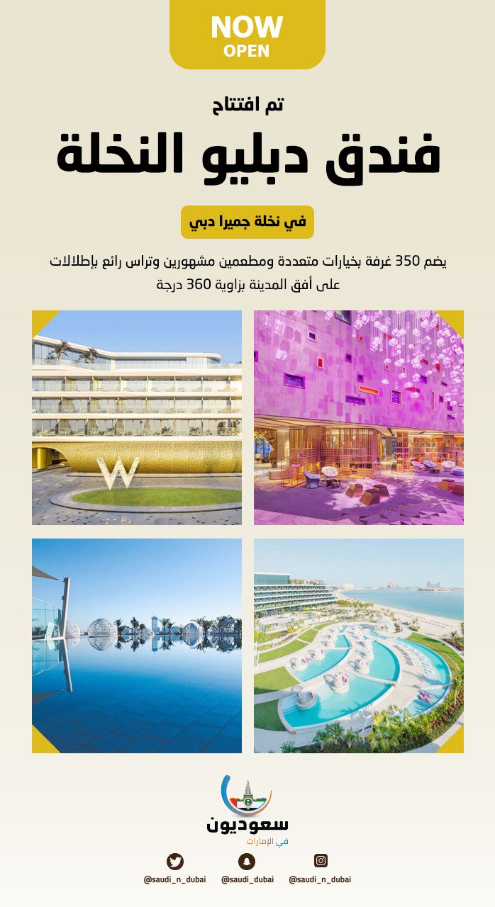 سعوديون في الإمارات Pa Twitter تابعوا تغطياتنا اليوم على حسابنا بسناب شات من فندق دبليو النخلة الذي تم افتتاحه قبل يومين في نخلة جميرا دبي يضم 350 غرفة بخيارات متعددة ومطعمين مشهورين وتراس رائع