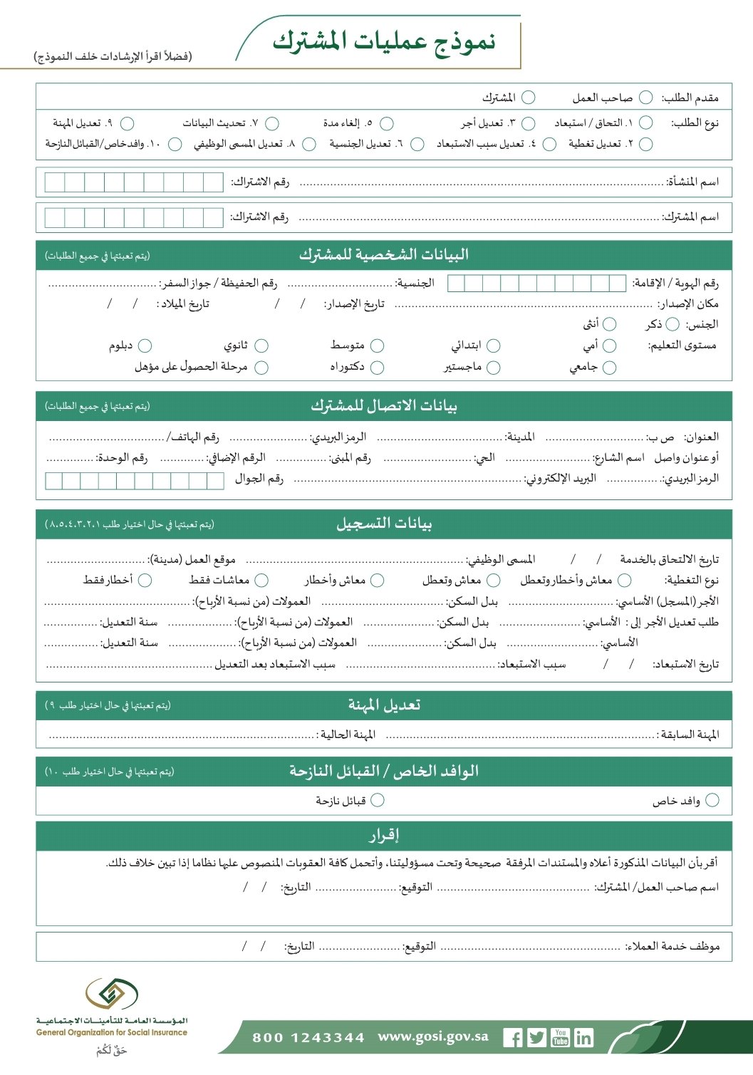 خدماتي الإلكترونية On Twitter يستخدم نموذج عمليات المشترك للعمليات التي تتم على سجل المشترك التحاق استبعاد التحاق باثر رجعي استبعاد باثر رجعي تعديل سبب الاستبعاد إلغاء مدة تعديل التغطية تعديل أجر تحديث بيانات تعديل المسمى الوظيفي تعديل